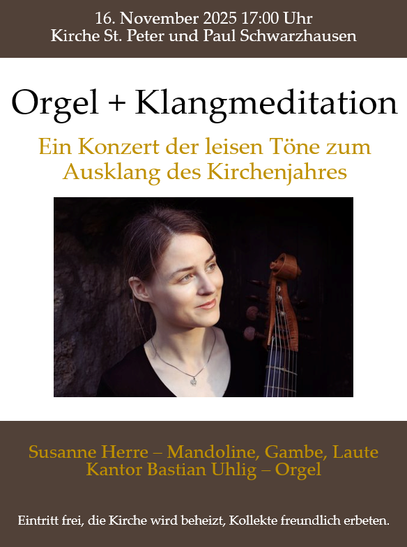 Kantor Bastian Uhlig (Orgel) und Susanne Herre (Erfurt) an historischen Streich- und Zupfinstrumenten musizieren ein Konzert der leisen Töne mit meditativer Kammermusik zum Ende des Kirchenjahres. Es erklingen Werke von J. S. Bach, Ortiz, Buxtehude und anderen Komponisten.- Eintritt frei, Kollekte erbeten -